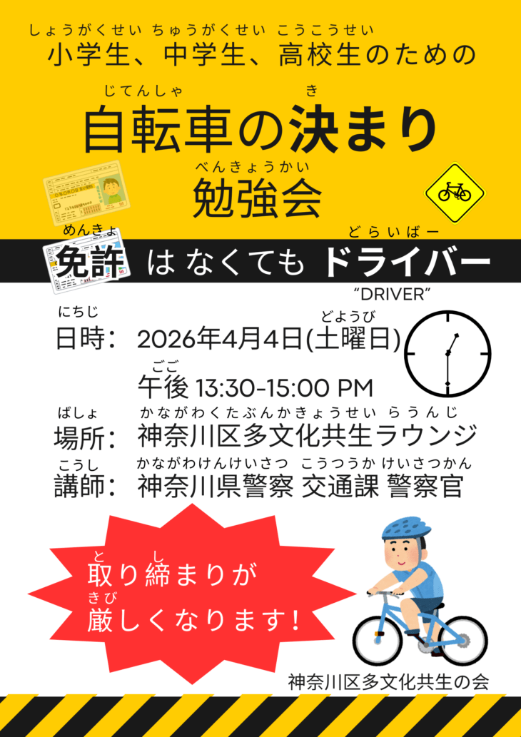 2026年4月4日(土)13:30~15:00、当法人主催により、神奈川警察署交通課のご協力のもと、「自転車の決まり勉強会」を神奈川区多文化共生ラウンジにて開催いたしました。