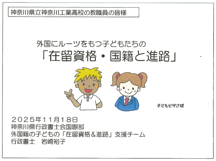 2025年11月18日(火)14:00~16:00、県立神奈川工業高校定時制において、同校教職員の皆様を対象とした在留資格に関する説明会が開催されました。本説明会は、同校からのご要請を受け、当法人が横浜市国際局の補助金対象事業として、県立神奈川工業高校定時制と神奈川県行政書士会との間をコーディネートし、実現したものです。