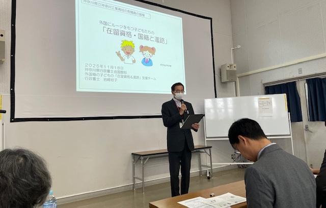2025年11月18日(火)14:00~16:00、県立神奈川工業高校定時制において、同校教職員の皆様を対象とした在留資格に関する説明会が開催されました。本説明会は、同校からのご要請を受け、当法人が横浜市国際局の補助金対象事業として、県立神奈川工業高校定時制と神奈川県行政書士会との間をコーディネートし、実現したものです。