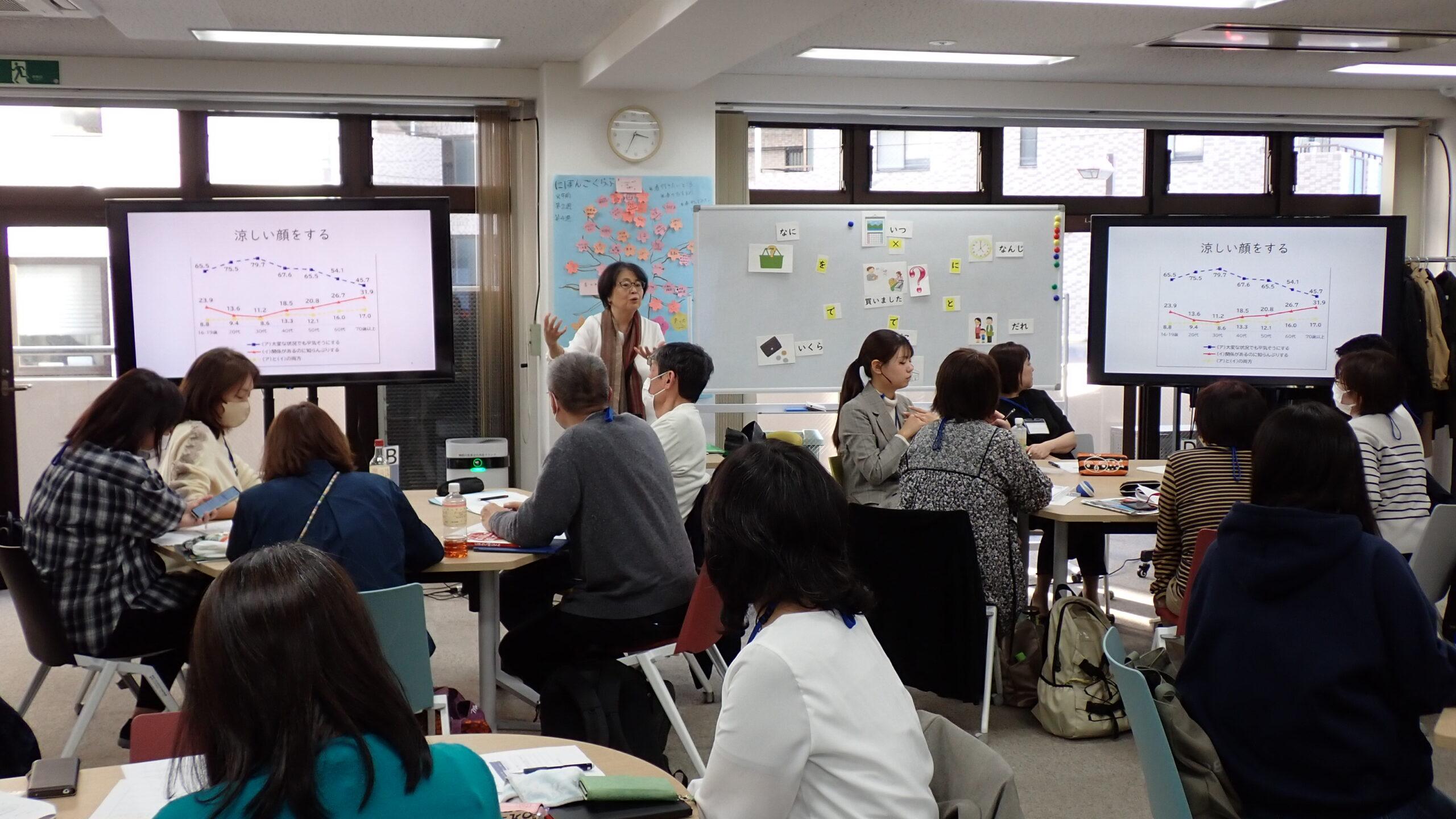 ボランティア未経験者が多い養成講座の講師は、日本語教育学会会員の吉田聖子先生にお願いしました。約30名の受講生が5つのテーブルに分かれ、毎回同じグループメンバーで受講しました。
